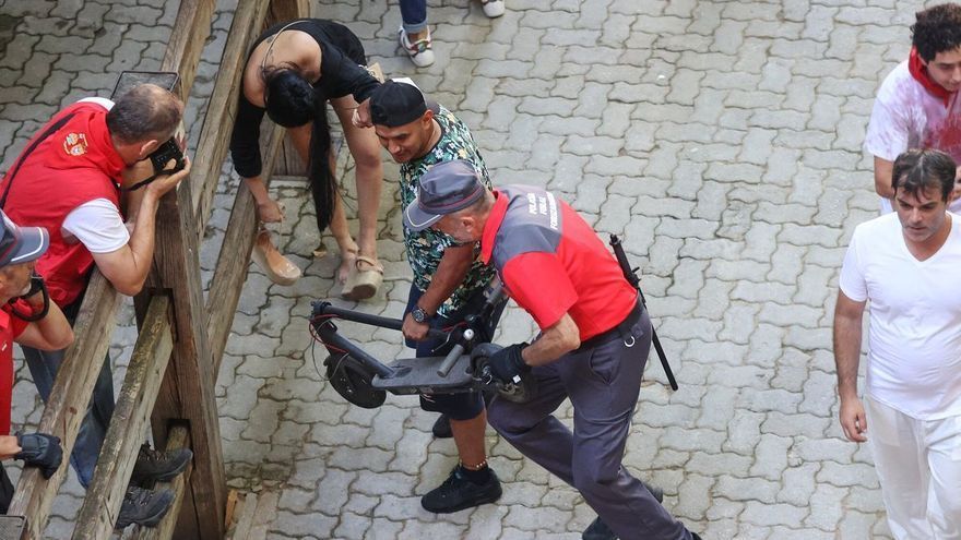 Patrullas de seguridad ciudadana han sido testigos de cuatro infracciones que han sido denunciadas tras identificar a sus autores. Una pareja de origen extranjero han sido denunciados por correr el encierro con un patinete eléctrico, que ha sido sacado del recorrido. Se trata de una infracción muy grave, al generar peligro para el resto de corredores.