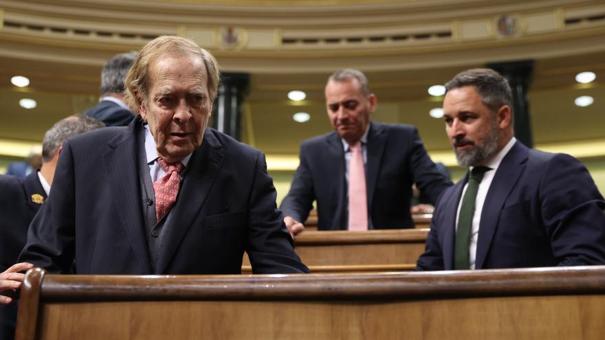 Ramón Tamames saluda junto a Santiago Abascal, esta mañana en el Congreso.