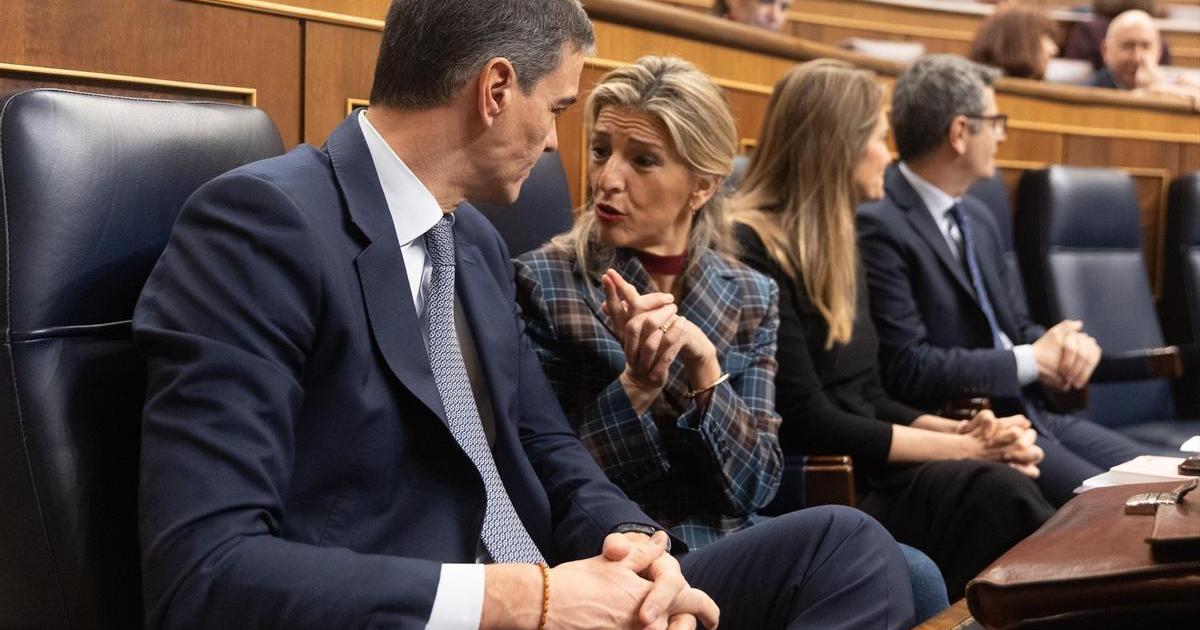 Pedro Sánchez y la vicepresidenta segunda y ministra de Trabajo, Yolanda Díaz, durante una sesión de control. / EP