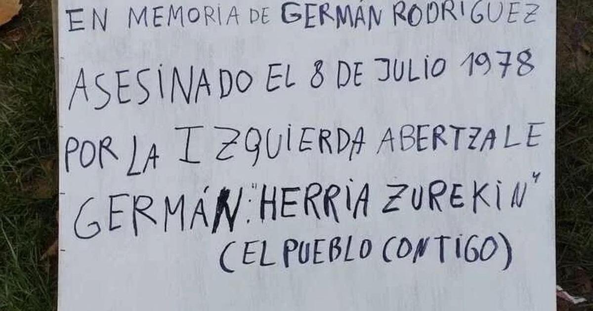 La placa en recuerdo a Germán Rodríguez ubicada en la avenida Roncesvalles de Pamplona ha sido vandalizada. Así lo ha denunciado mediante un comunicado la plataforma Sanfermines 78: gogoan!. En la estela original aparece inscrito el texto 'En memoria de Germán Rodríguez Saiz, muerto por disparo de la Policía el 8 de julio de 1978 - Germán Rodríguez Saizen oroimenez Poliziak tiros hil zuen 1978ko uztailaren 8an'. Sin embargo en las últimas horas, esta ha sido cubierta con una nueva leyenda que dice: 'En memoria de Germán Rodríguez, asesinado el 8 de julio de 1978 por la izquierda abertzale. Germán 'Herria zurekin' (el pueblo contigo)'.