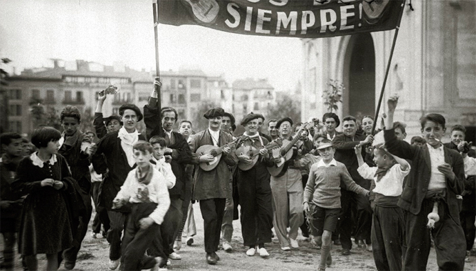 Hemos de ponernos en situación. En aquella época, las cuadrillas de mozos salían a la calle a beber y bailar e iban a los toros con pancarta, pero todavía no gozaban de la institucionalización posterior. Las mozas no llegarían hasta mucho después y la denominación de "peñas" tardaría en imponerse; en las primeras décadas del siglo la prensa solía llamarles la "gente de bronce", lo que ha generado la leyenda de que existía una cuadrilla con tal nombre, antecedente de la peña Los de Bronce fundada en 1950. No solían tener sede propia sino que se reunían en algún bar y su duración solía ser muy irregular, algunas no duraban más allá de una o unas pocas ediciones de las fiestas. Las cuadrillas no se acompañaban de una charanga profesional, ni siquiera existía todavía la música que hoy se tiene por típicamente sanferminera, tocaban tanto instrumentos de cuerda como los de viento que acabarían por predominar, y también debía de ser usual que llevaran todo tipo de artilugios sonoros, incluidos "pitos de a perra gorda", con los que producir más ruido que música. El periódico La Democracia escribía el 9 de julio de 1932: "Las cuadrillas de mozos saltarines arrastran a los últimos perezosos, camino ya de la Plaza, entre estridencias de raro instrumental y pinceladas agudas de cartelones heraldos".