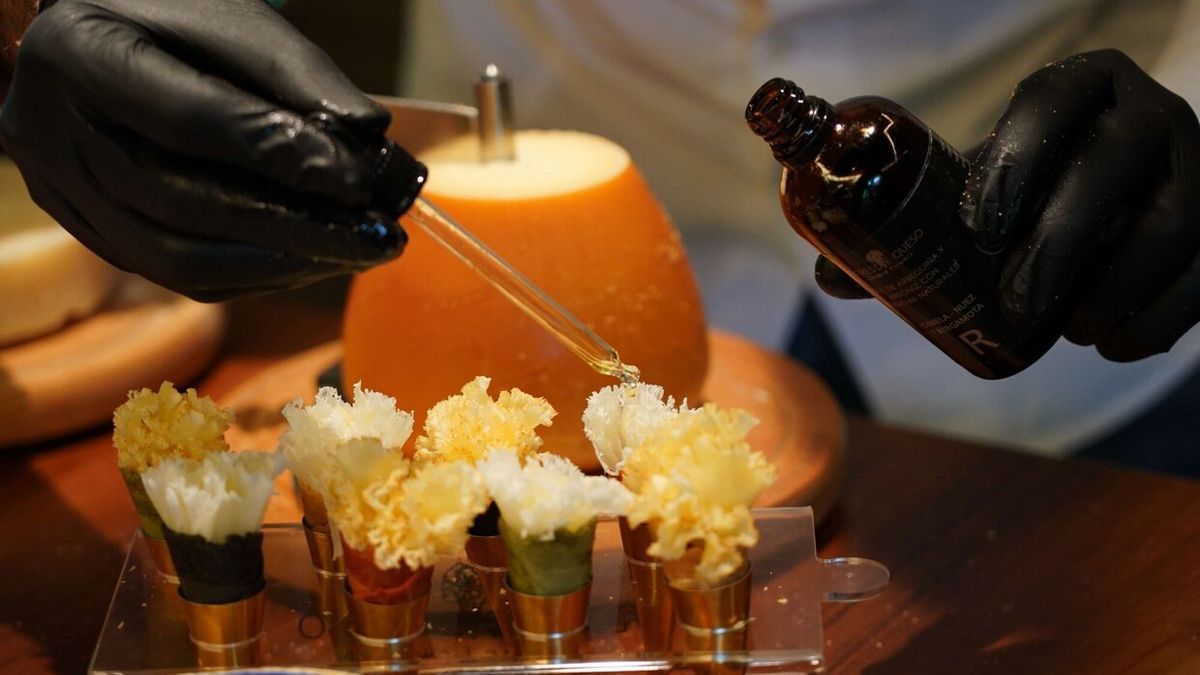 Con gran precisión técnica, inherente de sus años de experiencia como herrero, Mohedano rasca las virutas de queso, aderezando el tallo conformado por el cucurucho con las esencias y emulsiones caseras que prepara él mismo. El proceso es relativamente sencillo, pero el resultado final se traslada en un maridaje perfecto entre lo dulce y lo salado que sorprende hasta al más escéptico.