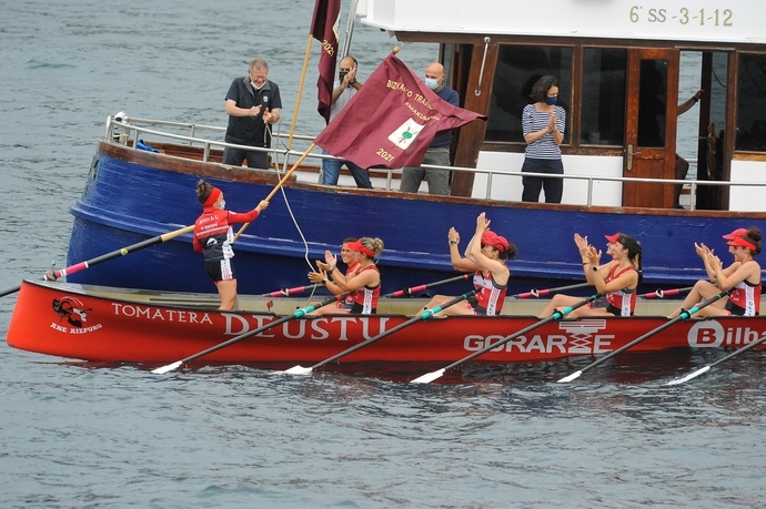 Las remeras de Deusto festejando en triunfo en aguas de Lekeitio. Foto: José Mari Martínez Los pronósticos también se cumplieron en la regata femenina. Deusto marcó la proa de la regata desde las primeras paladas y abrió un hueco superior a un bote antes de la última ciaboga. Su dominio se amplió en el largo de vuelta y solo en los metros finales tuvieron alguna dificultad, cuando Ondarroa amenazó con acercarse después de una serie de olas. Sin embargo, la victoria de la Tomatera no llegó a estar en duda y cruzó con cinco segundos de ventaja sobre las ondarrutarras. Isuntza llegó en tercer lugar y Lutxana cerró el campeonato con su cuarto puesto.