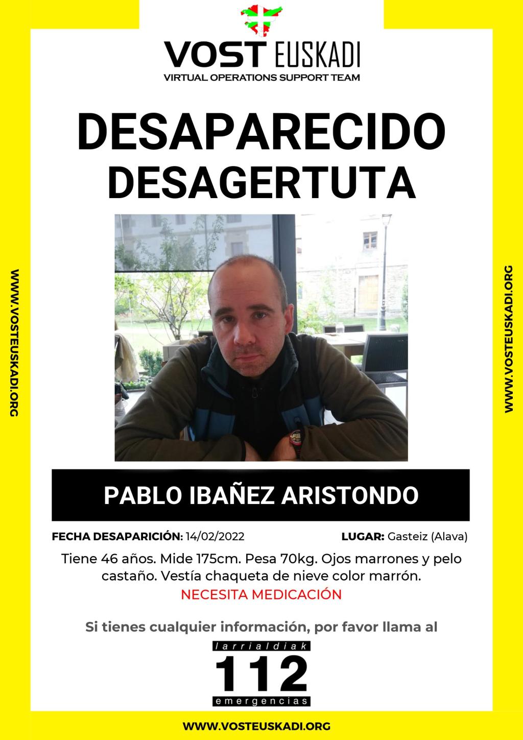 Según han difundido desde VOST Euskadi, el varón desaparecido mide 1,75 metros, pesa 75 kilos, tiene los ojos marrones y el pelo castaño.