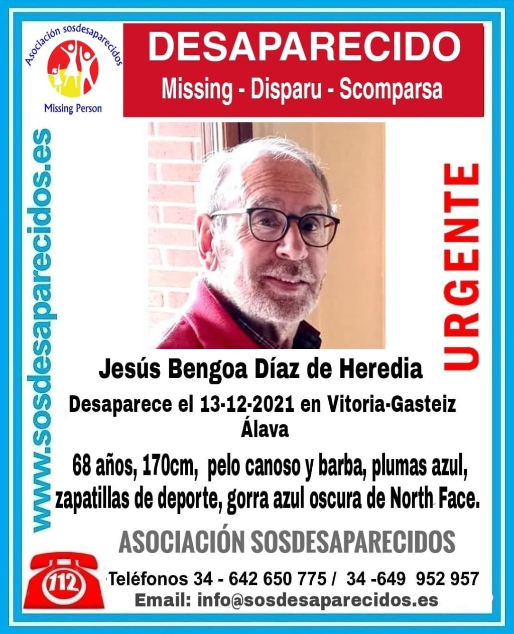 Según han trasladado los familiares y allegados, se trata de Jesús Bengoa Díaz de Heredia, de 68 años. 1,70 metros de altura, pelo canoso y barba. En el momento de su desaparición, portaba un abrigo de plumas azul, zapatillas de deporte y gorra de color azul oscuro.