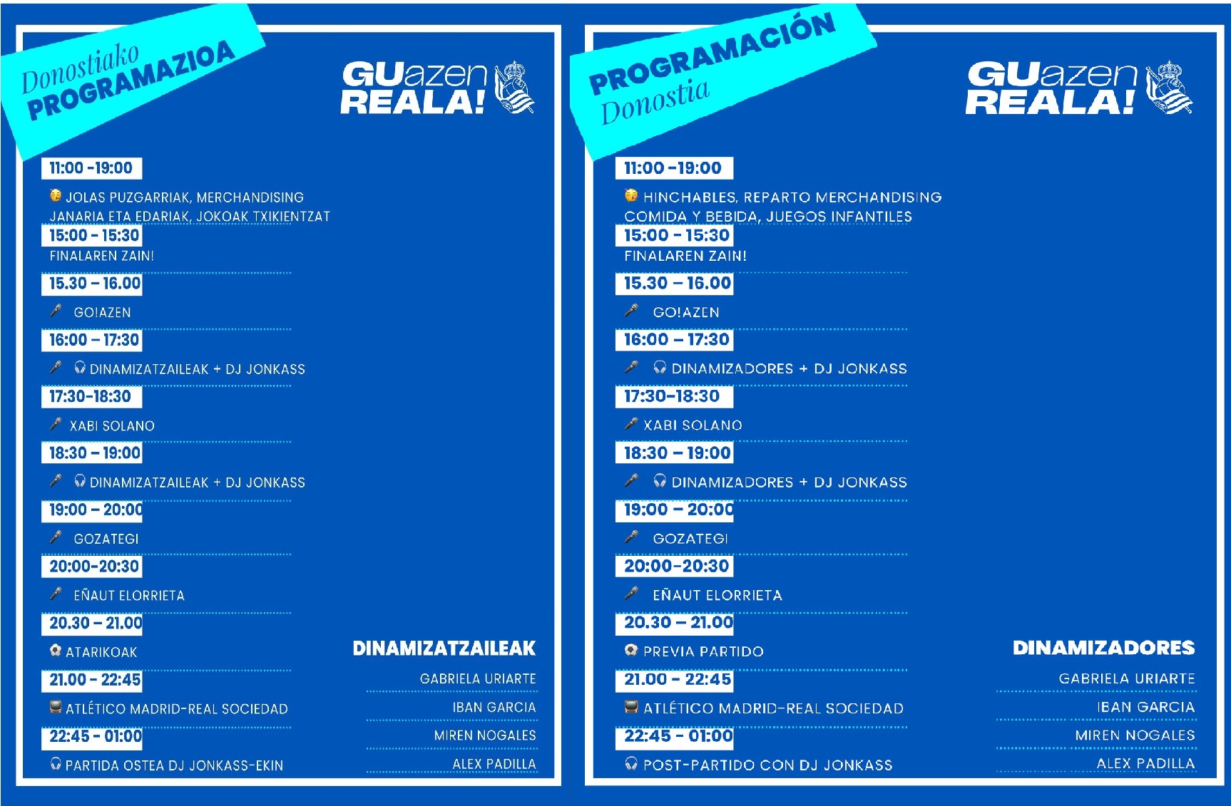 En Sevilla, los aficionados de la Real Sociedad están citados en la Avenida de Carlos III, junto al apeadero de La Cartuja, a menos de 10 minutos del estadio. En esta Fan Zone, actuarán artistas como Zeatikez, Tinez, Nøgen, Janus Lester, y Süne, entre otros, además de los DJs Alex del Toro, Txolas y Aitor García. Una de las sorpresas de la programación ha sido Txurdin, la mascota de la Real, que se apunta a las actuaciones justo antes de que comience la kalejira, que saldrá de esta Fan Zone a las 18:30h de la tarde del sábado hacia el estadio y que estará amenizada por la txaranga Ilargi.