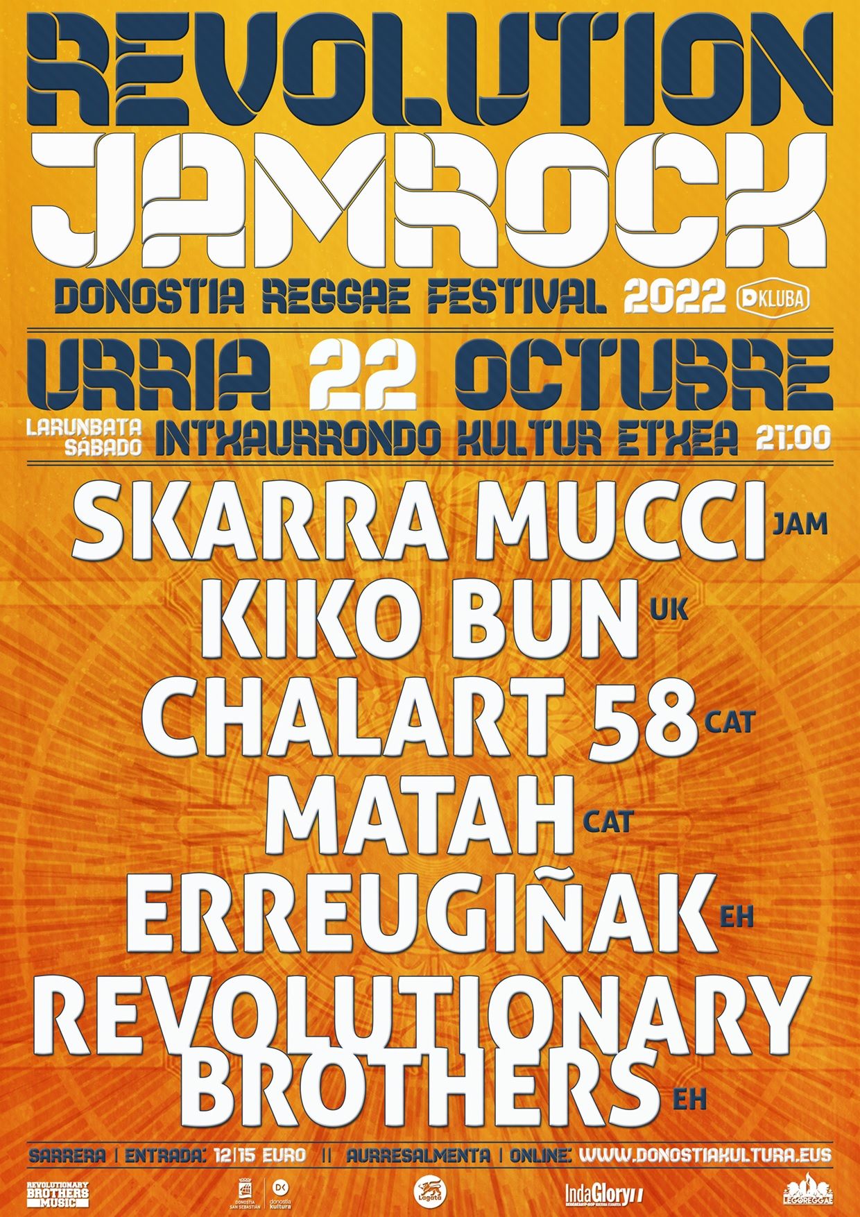 Tras dos décadas de trayectoria musical Revolutionary Brothers ha decidido aprovechar la novena edición del festival Revolution JamRock para celebrar su aniversario. Un evento que dará comienzo a las 21:00 horas y que durará hasta las dos de la mañana. Al escenario de la Kultur Etxea de Intxaurrondo se subirán grandes artistas como Skarra Mucci, llegado desde Jamaica es cabeza de cartel. Aunque como gran reclamo también está Kiko Bun, el inglés que pisará por primera vez Euskadi en el marco de este festival.
