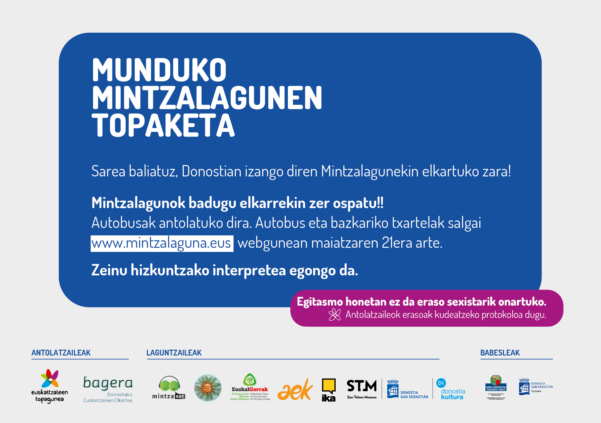 Donostian jaio zen mugimendua, horrexegatik dauka esanahi berezia gaurko festa hiri berean egiteak. Euskal Herriko zein diasporako mintzalagun, mintzakide eta berbalagunek elkar ezagutuko dute mintzodromo digitalari, Mintzaneti esker. Estatu Batuak, Frantzia, Mexiko, Irlanda, Argentina, Uruguay, Txile,
