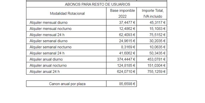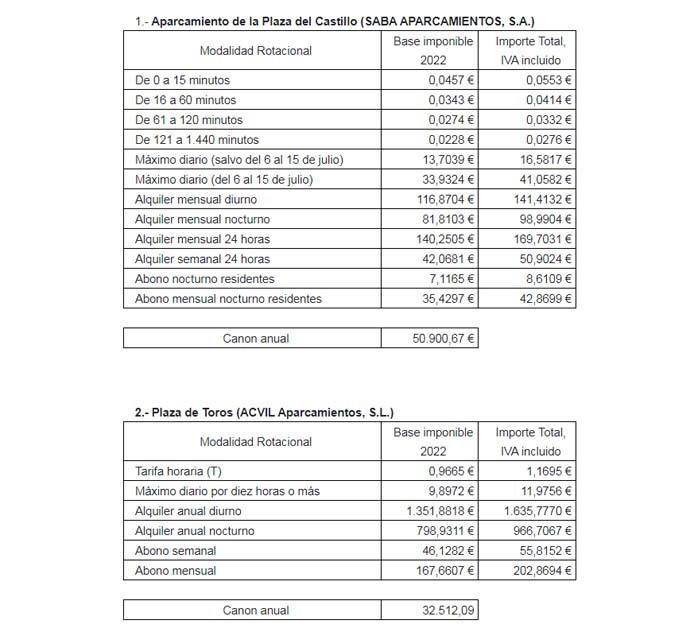 Tarifas máximas de los aparcamientos públicos de concesión administrativa 2022