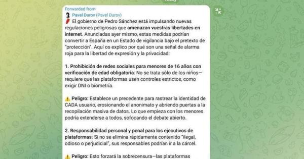 Para el fundador de Telegram, estas medidas podrían convertir a España en un Estado de vigilancia bajo el pretexto de "protección". De esta manera, ha señalado que prohibición de redes sociales para menores de 16 años con verificación de edad obligatoria requiere que las plataformas usen controles estrictos, como exigir DNI o biometría.