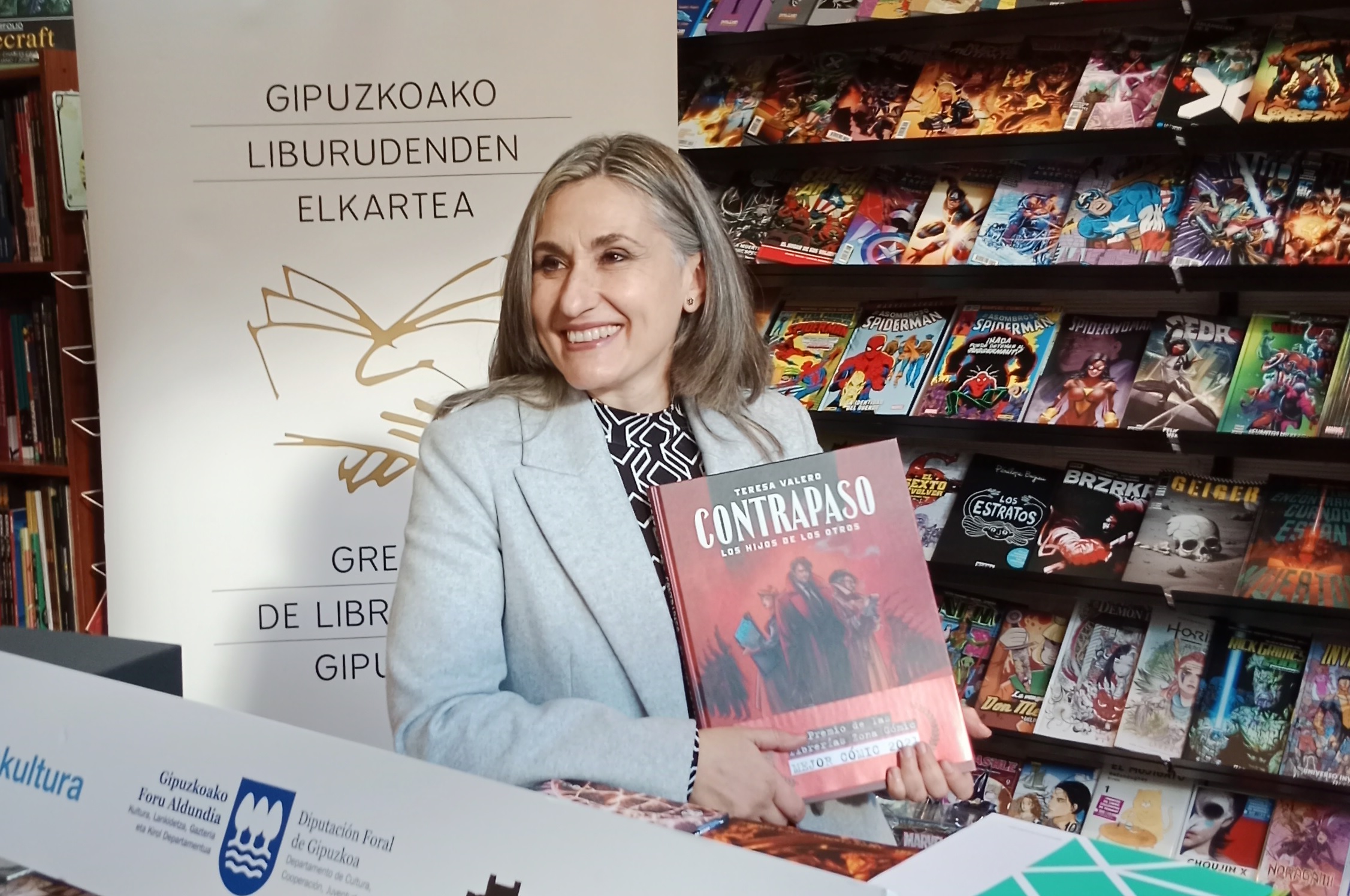 La ilustradora y guionista de cómics Teresa Valero ha recibido esta mañana el Euskadi de Plata en categoría de cómic y libro ilustrado por su trabajo 'Contrapaso. Los hijos de los otros'. Se trata de un galardón que, por primera vez, ha entregado hoy el Gremio de Libreros de Gipuzkoa. Entrevistada en Onda Vasca, Valero ha asegurado que recibe este premio "con mucha ilusión. Es un reconocimiento que ha venido de sorpresa, no lo esperaba; pero los reconocimientos que vienen por parte de libreros hacen una especial ilusión".