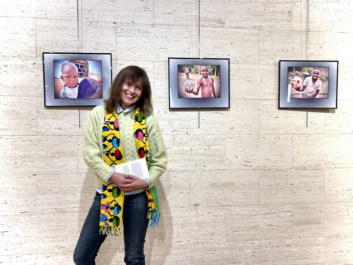 Cristina Maruri posa junto a dos de las fotos de su muestra. Foto: M. A. P. El próximo paso que pretende dar The Lights of Kazinga consiste en poder adquirir unos pollos y unas gallinas para crear su propia granja y, así, vender huevos para seguir dando potencial económico a un proyecto que está creciendo muy rápido.