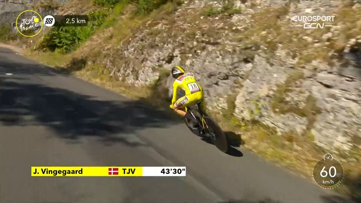 El danés, a punto de caer, bate a Pogacar y completa una excelente crono en Rocamadour, donde solo Van Aert puede con él