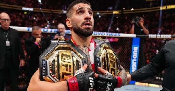 Ilia Topuria, tras noquear a Charles Oliveira y proclamarse doble campeón mundial de la UFC.