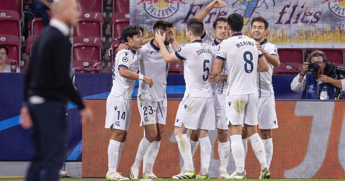 Los futbolistas de la Real festejan el 0-2 de Brais Méndez en Salzburgo. / EFE
