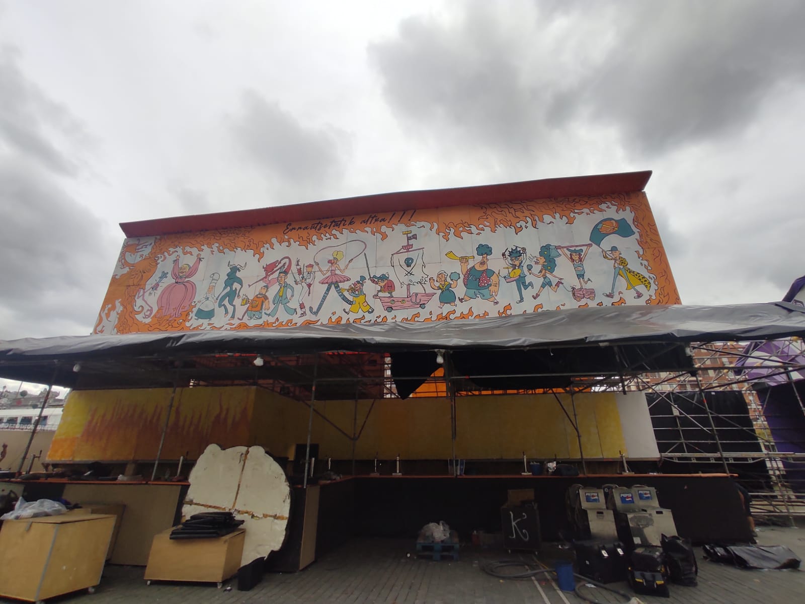 El ruido de las furgonetas con su ir y venir, los martillazos y los pinceles de pintura, son los protagonistas en los tinglados del Arenal, y en la trasera y lateral del teatro Arriaga, para que todo esté a punto mañana, a partir de las 7 de la tarde, cuando Marijaia salude desde la balconada del Arriaga.