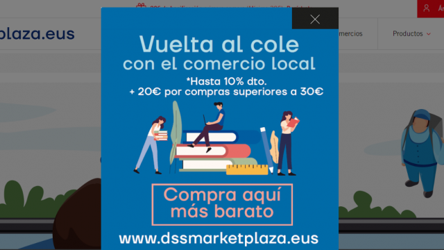 La plataforma DSS Market Plaza ha puesto en marcha la campaña 'Vuelta al cole' que ofrece descuentos directos a quienes realicen compras a través de esta web que reúne a 140 pequeños comercios de Donostia. En concreto, se aplicará una bonificación automática de 20€ a quienes realicen una primera compra superior a los 30€ (con un límite de 3.000 beneficiarios). Además, se aplicará un descuento del 10% (con un máximo de 5€) en todas las compras.