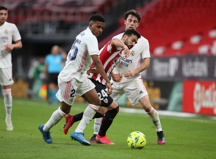 Balenziaga pugna por el balón con Rodrygo y Odriozola. Foto: Borja Guerrero El nivel del Athletic se reflejó en el desconcertante modo de ejecutar faltas, córners o saques de banda: prácticamente todos, mal. No se sabe si por dejadez, ausencia de concentración o que los chicos se levantaron con mal pie, aunque comprobar cómo un equipo se deja ir de esa manera resulta irritante. El balón como enemigo, sería la consigna más acertada para describir la ensalada de concesiones. Si se exceptúan detalles a cargo de Sancet y Berenguer, nada hubo rescatable en las posesiones locales. Pero en tareas de contención, se ha de reconocer que la respuesta fue eficaz. Basculaciones, ayudas, contundencia en los despejes, vamos un trabajo suficiente para desactivar a un Madrid que por los síntomas que emitía se desactivaba por sí solo.