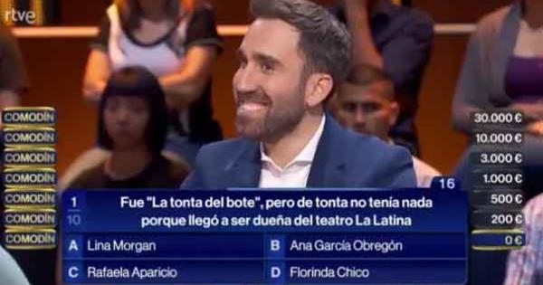 Juan se enfrentaba a la siguiente pregunta: "Fue 'La tonta del bote', pero de tonta no tenía nada porque llegó a ser dueña del Teatro La Latina". Las opciones de respuesta eran Lina Morgan, Ana García Obregón, Rafaela Aparicio y Florinda Chico.
