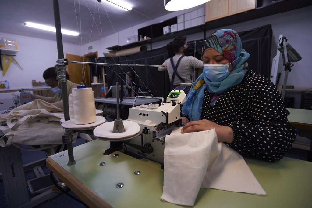 Hind Faraji, con la máquina de coser. Fotos: Iñaki Porto