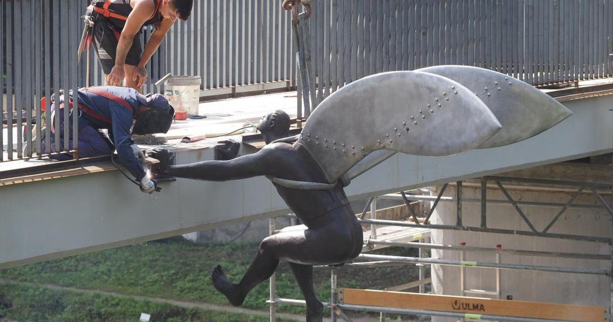 La figura de Ícaro ha vuelto a su emplazamiento en el puente de Urazandi de Elgoibar después de permanecer ocho meses alejado de él.