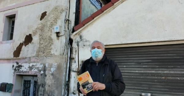 Etxebarria, con su libro bajo el indicador del antiguo municipio Santurce Ortuella.
