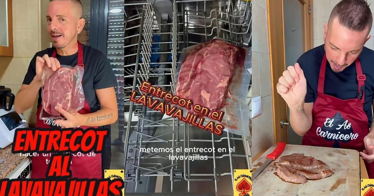 Nadie se plantearía freír un entrecot en un aparato pensado para lavar platos, vasos y cubiertos, pero se puede hacer y al parecer no queda mal. Es lo que defiende el popular carnicero Mariano Sánchez Díaz, conocido en sus redes sociales como El As Carnicero y que cuenta con casi 100.000 seguidores en Instagram.