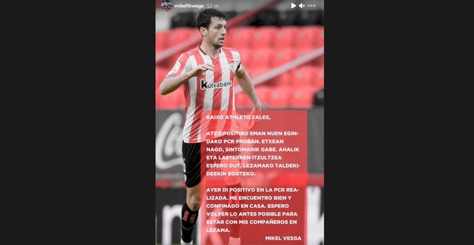 El Athletic ha informado que se ha detectado un caso de positivo por covid en las pruebas PCR, antígenos y serológicas realizadas ayer en Lezama "a los jugadores y al personal en contacto con el primer equipo masculino". El jugador afectado es Mikel Vesga. El centrocampista lo ha hecho público a través de sus redes sociales.