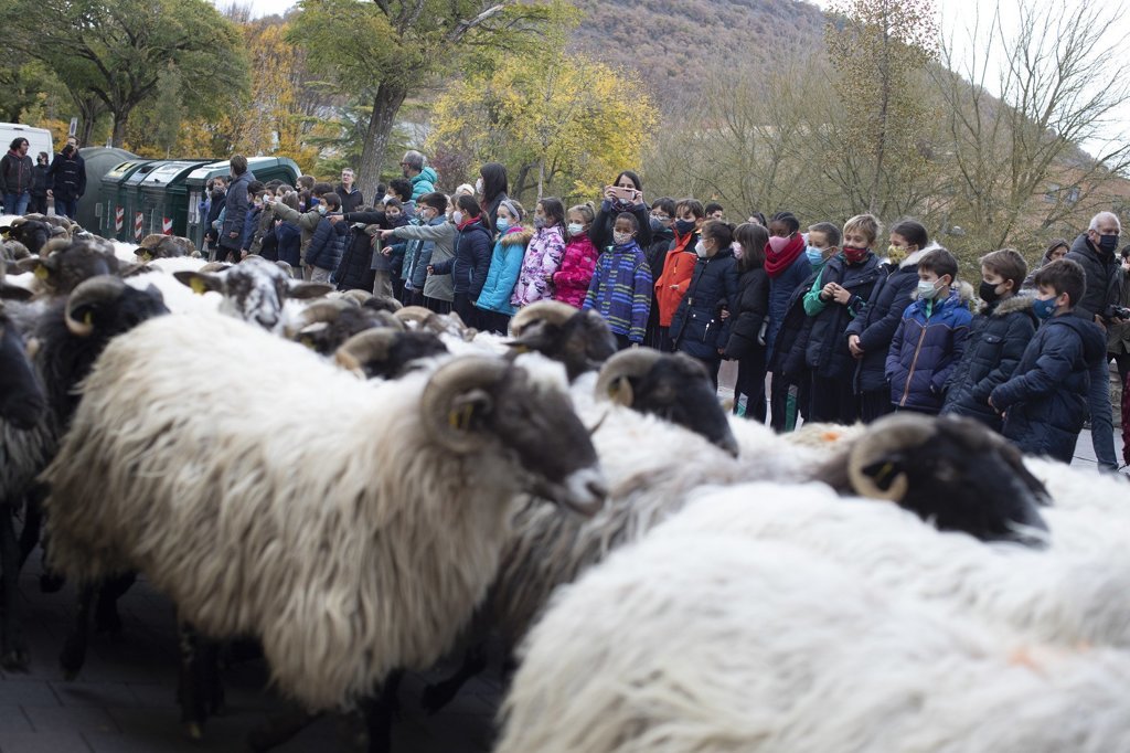 También eran un manojo de nervios Ainara Rodríguez, Aintzane Iturri, Amaia Mendoza, Ireber Zamora y Naroa Olaetxea, de la ikastola Atargi, que nunca habían visto pasar ovejas por su pueblo. "Nos hace mucha ilusión", han dicho, emocionadas. Podrán visitar al rebaño en el monte las veces que quieran durante las 3 o 4 semanas que permanezca haciendo las labores de desbroce, en función de lo que les cueste y del clima que venga: abonar, limpiar y mantener. Es lo que toca.