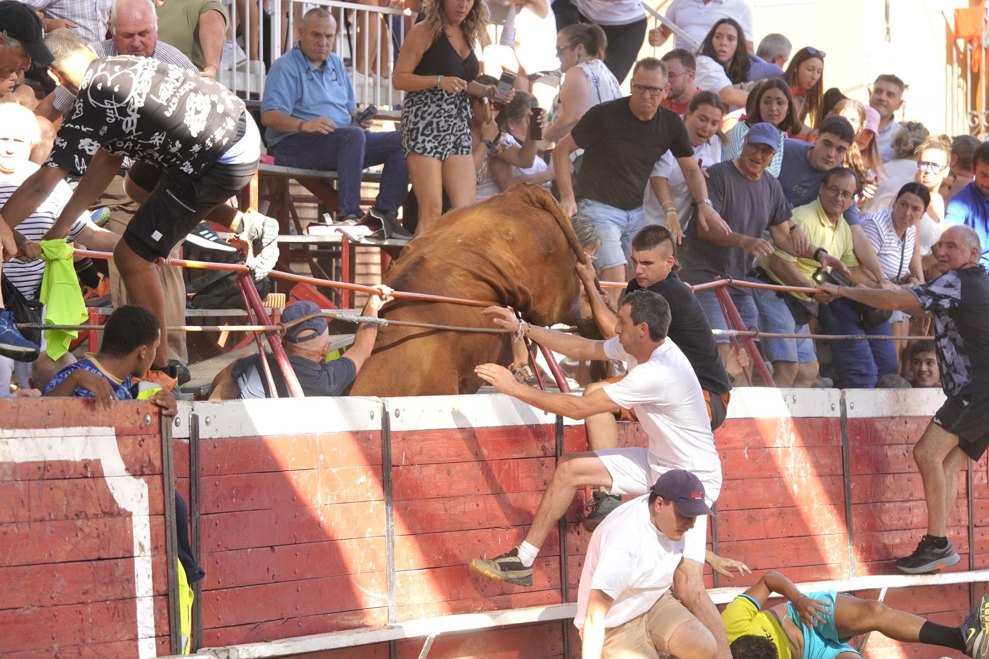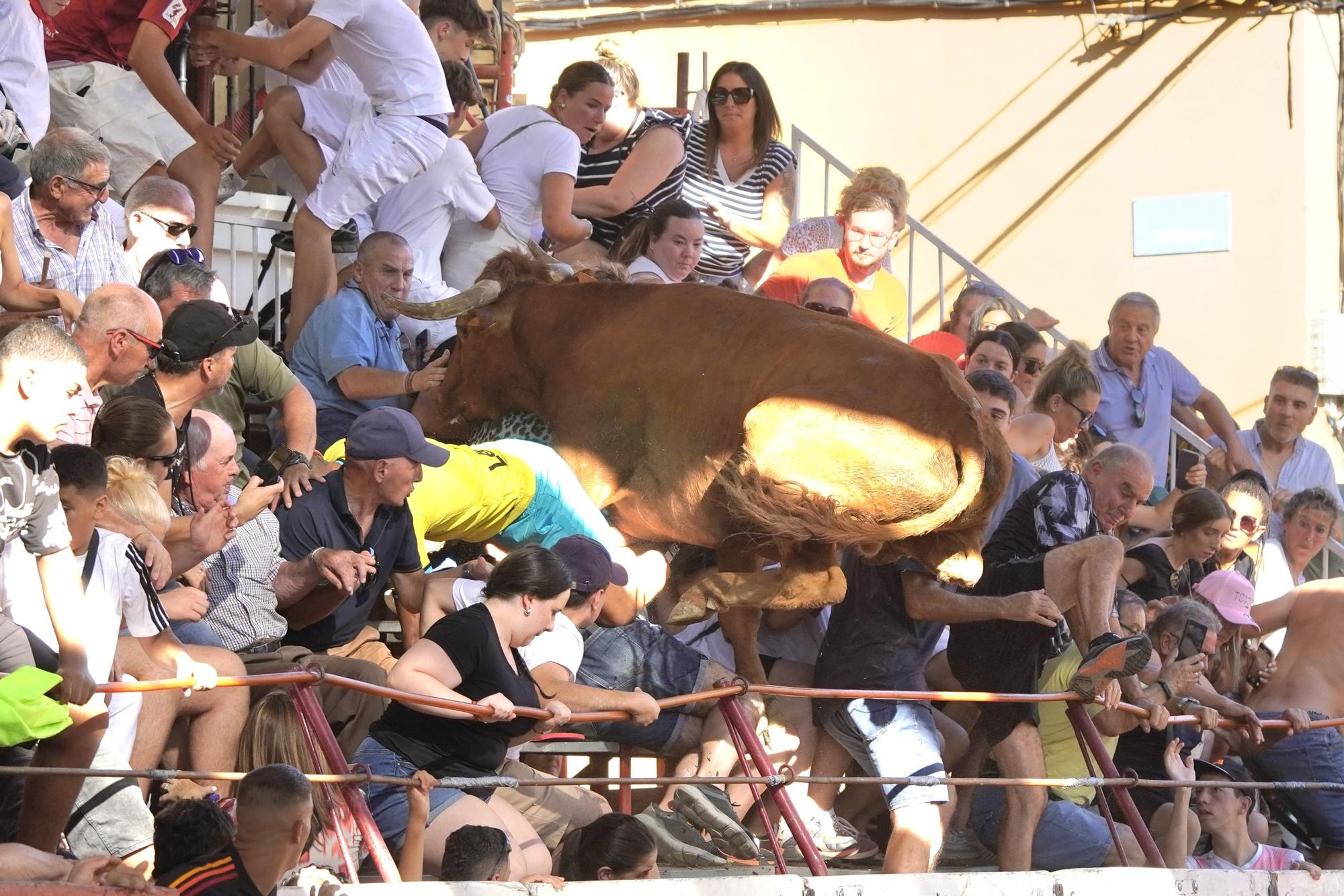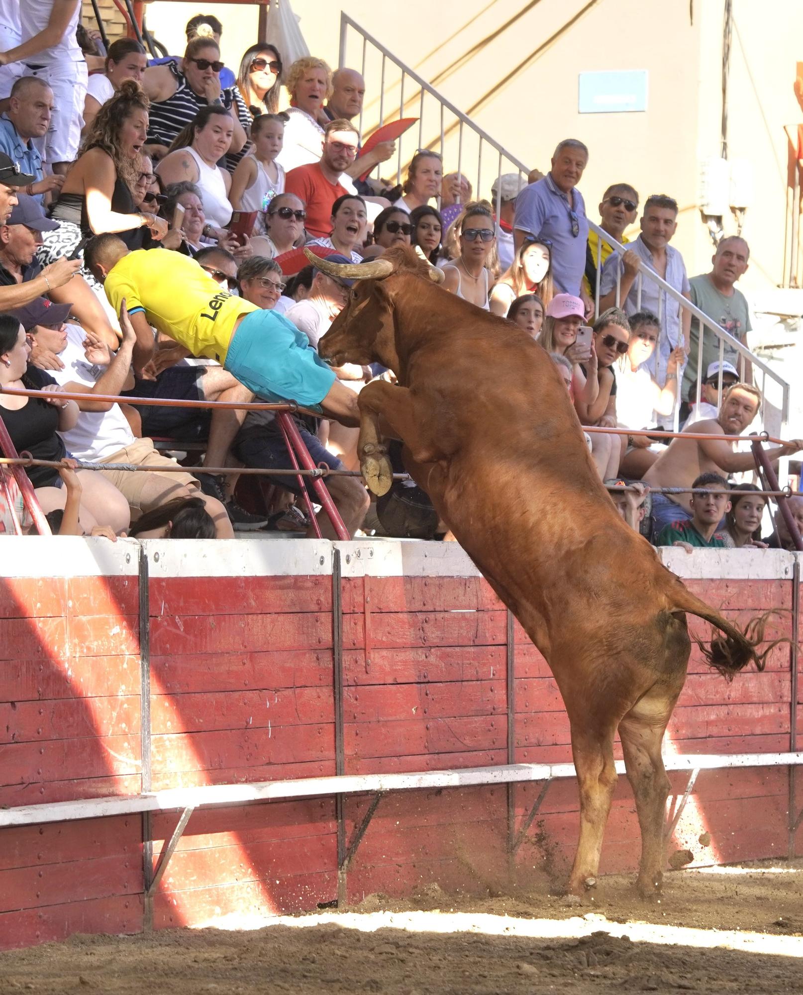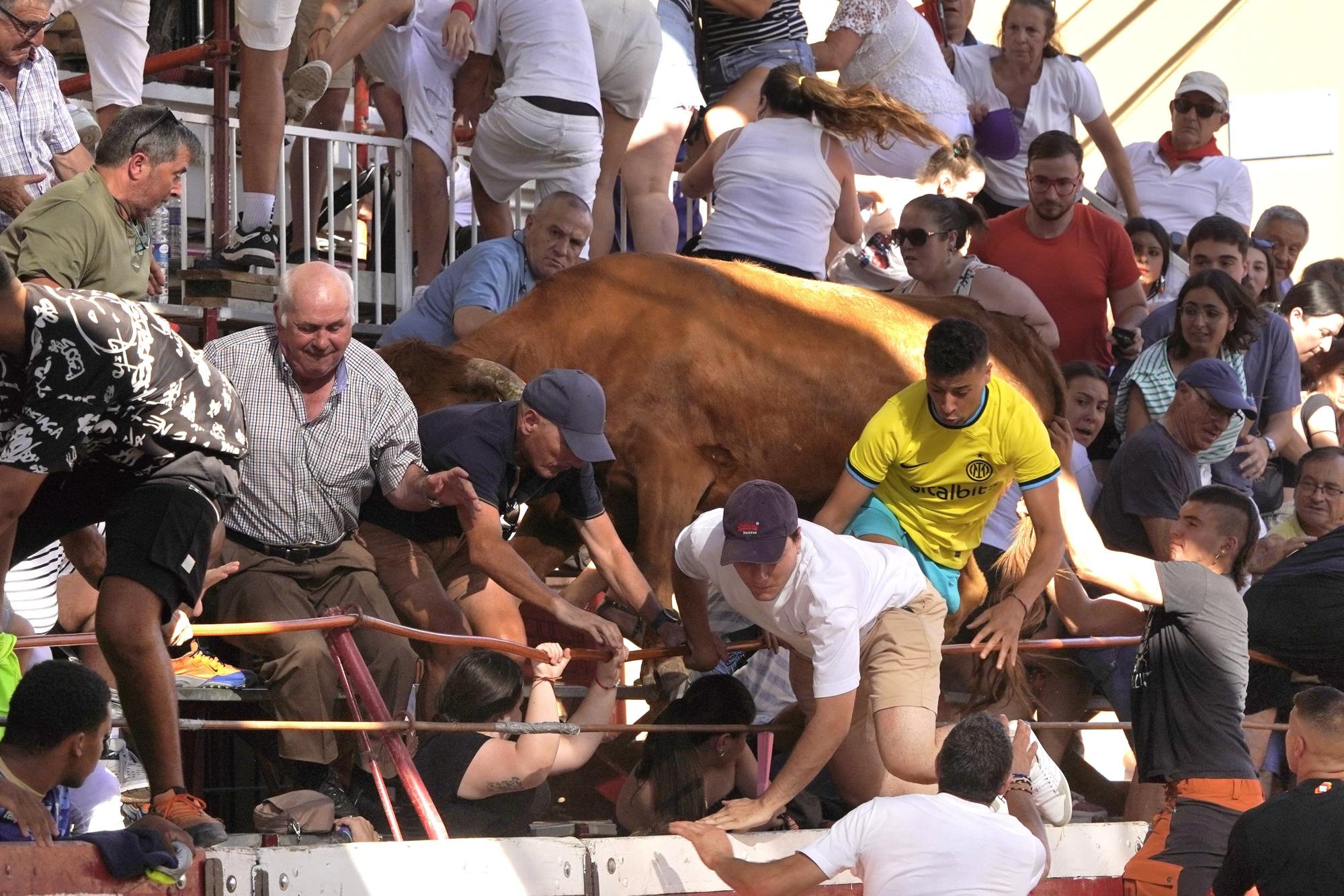 'Labrador', uno de los toros capones de la ganadería de José Arriazu de Ablitas, se ha convertido en protagonista cuando el recortador arnedano Moha Nabil de 33 años ha efectuado un apurado quiebro que el animal ha seguido hasta la barrera donde ha saltado y ha accedido a la grada provocando momentos de gran nerviosismo e hiriendo a dos de los espectadores.