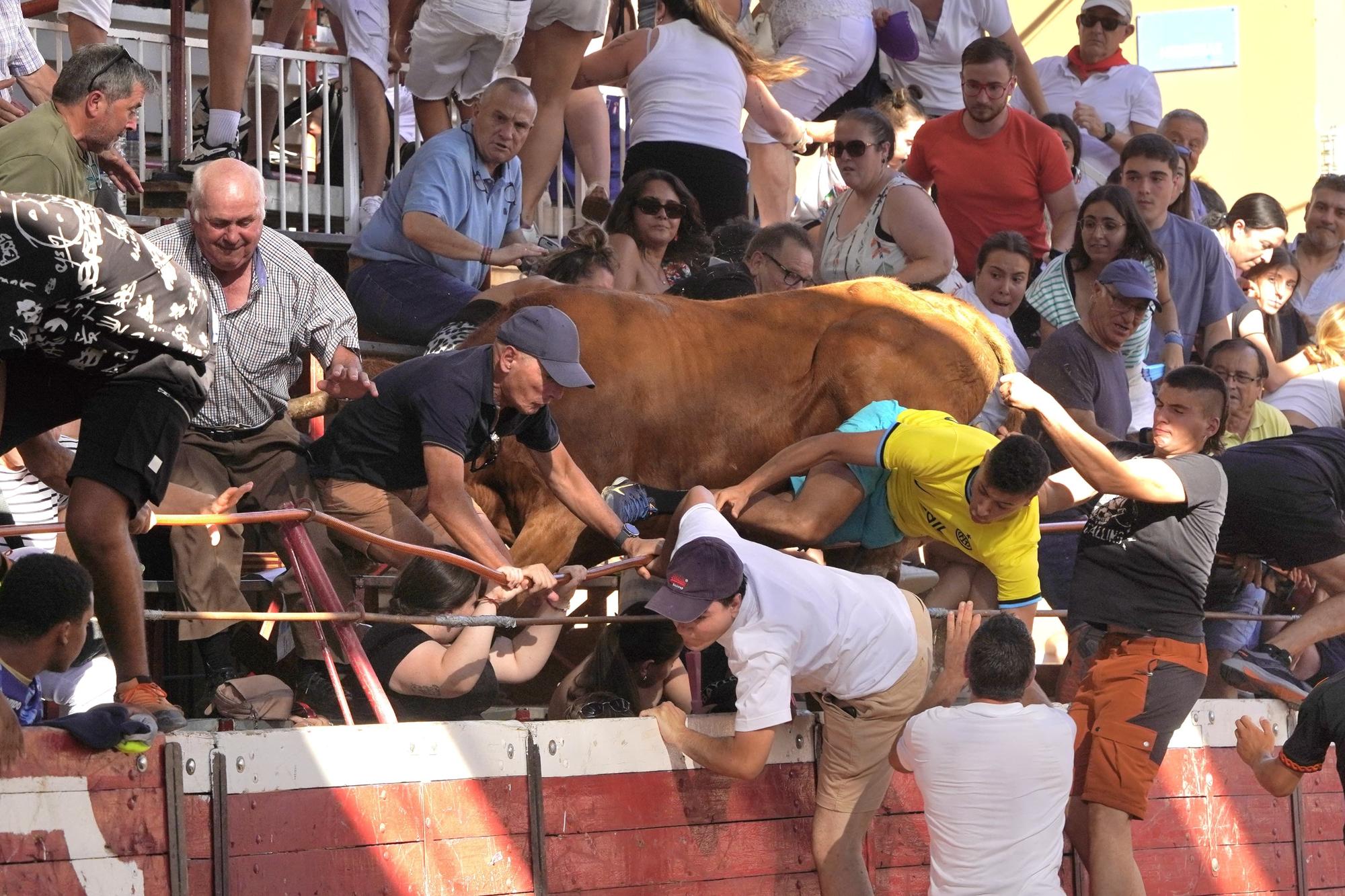 El capón ha tenido que ser sujetado con una soga para ser devuelto a la plaza sin que hubiera más percances, aunque el festejo taurino tuvo que suspenderse mientras se atendía y trasladaba a los heridos, para reanudarse después aunque los astados ya no salieron a por las calles de Cadreita como es tradición.