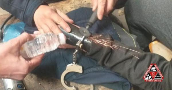 Los Bomberos de Vitoria, "tras comprobar que todo era correcto", procedieron a cortar los grilletes, según explicaron ellos mismos en sus redes sociales, con una pequeña rotaflex y mucha paciencia, hasta que finalmente lograron liberar la mano del hombre esposado.