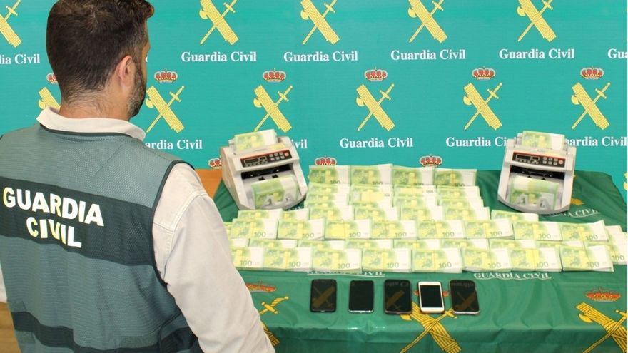 Los investigadores hallaron en el momento de la detención 743.200 euros en billetes falsos y 11.500 euros en billetes de curso legal que eran utilizados para dar veracidad al conteo del dinero ante la víctima.