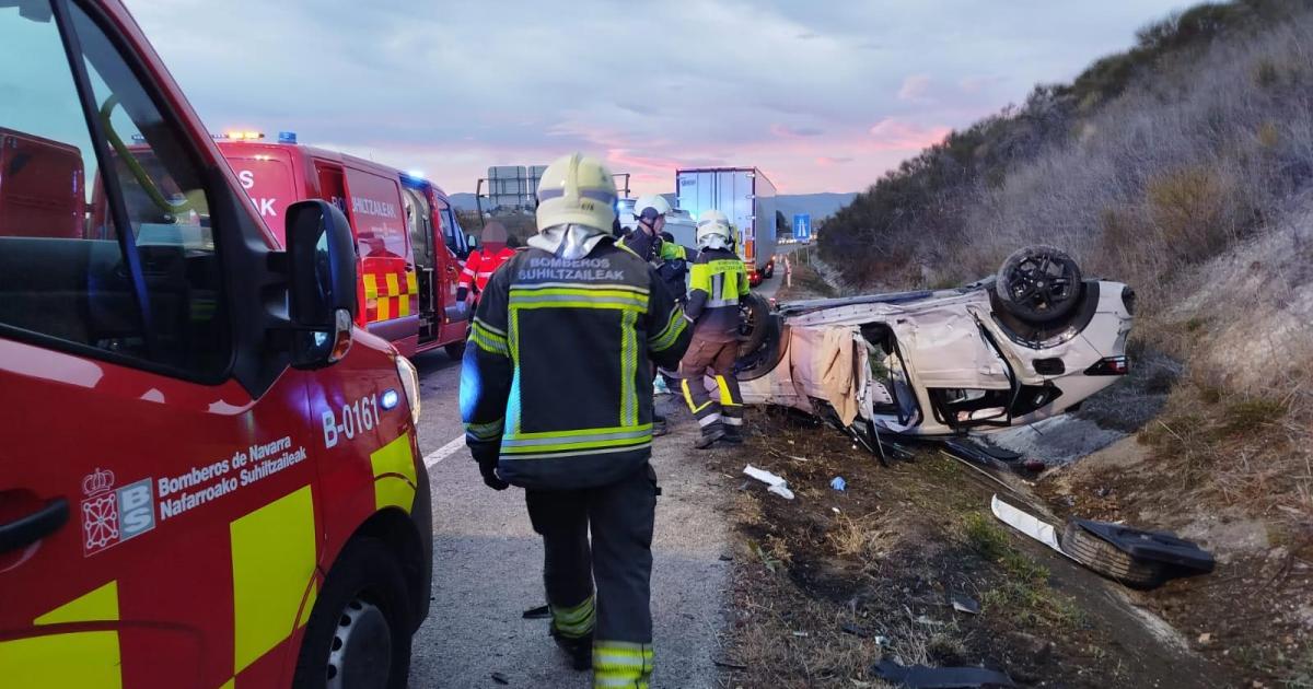 Bomberos junto al coche accidentado en la A-15 en Esquíroz. CEDIDA