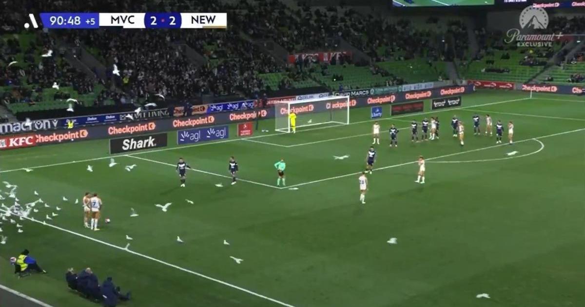 Sucedió en el AAMI Park, en Melbourne, cuando decenas de aves se hicieron con una zona del campo justo cuando el Newcastle se disponía a lanzar una falta. El jugador Lachlan Bayliss no lo tenía fácil, porque había más gaviotas que rivales alrededor del balón y tampoco habría sido una imagen agradable estrellar el esférico contra algún ave. Así que la escena obligó a esperar unos segundos hasta que las gaviotas decidieran moverse.