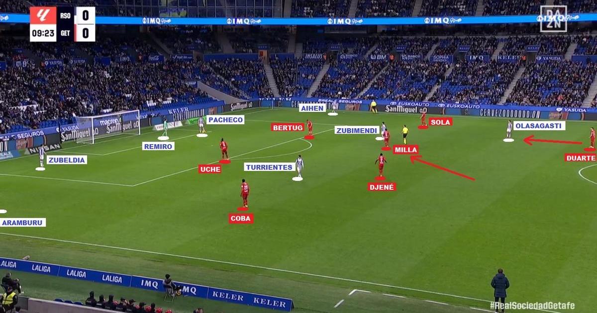 La Real siempre estuvo incómoda sobre el terreno de juego, algo que pudo comprobarse desde los primeros segundos de partido. El Getafe se lanzó a presionar arriba a los txuri-urdin, emparejando a todos sus futbolistas con jugadores locales. Para que el 4-4-2 de los azulones encajara con el 4-3-3 blanquiazul, el pivote Milla avanzaba su posición para presionar a Zubimendi, y detrás el central Duarte hacía lo propio para apretar a Olasagasti.