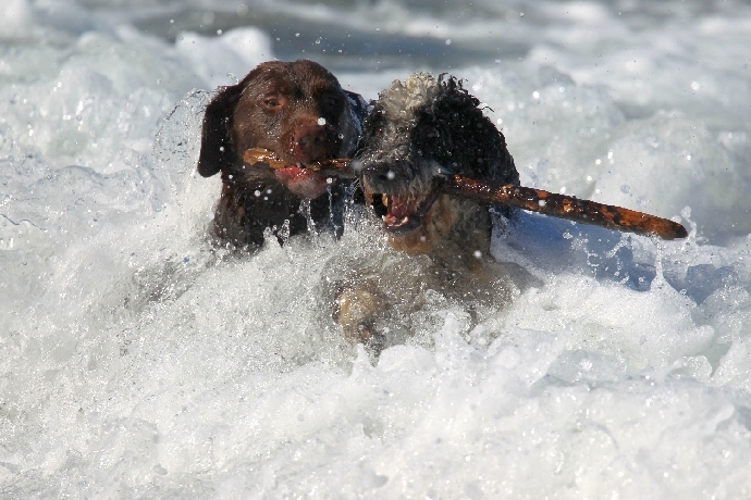 Dos perros jugando con un palo en el mar FOTO: Juan Lazkano Esto se opone a la decisión de Plentzia, a media hora de Bilbao, de permitir el acceso a cualquier hora fuera de temporada, desde octubre hasta semana santa, y establecer un horario dentro de la temporada, de 21.00 horas a 6.00 horas.