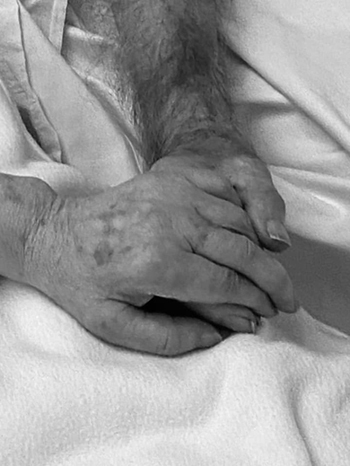 Las manos de Jesús Pérez y Merche Sarasa. El hecho de que sus padres hayan dejado de respirar a la vez y de la mano ha sido "un regalo de vida y muerte y un gesto de gran humanidad por parte del servicio hospitalario" declara Rakel.