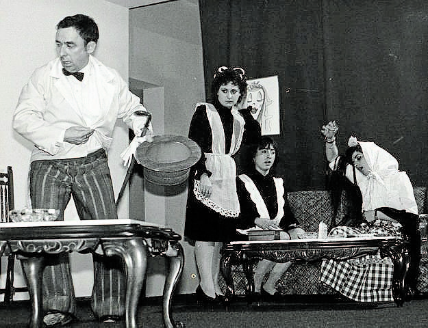 Interpretación de la obra 'Nosotros, ellas y el duende'. Después, en el hogar del jubilado, en la parte de arriba, "cuando éramos mozos, quedaba una planta vacía y allí nos reuníamos para hacer obras de teatro. Cobrábamos una entrada simbólica y con lo que íbamos sacando compramos el cortinaje, el telón y pusimos el suelo en cuesta para que todos pudieran ver mejor".