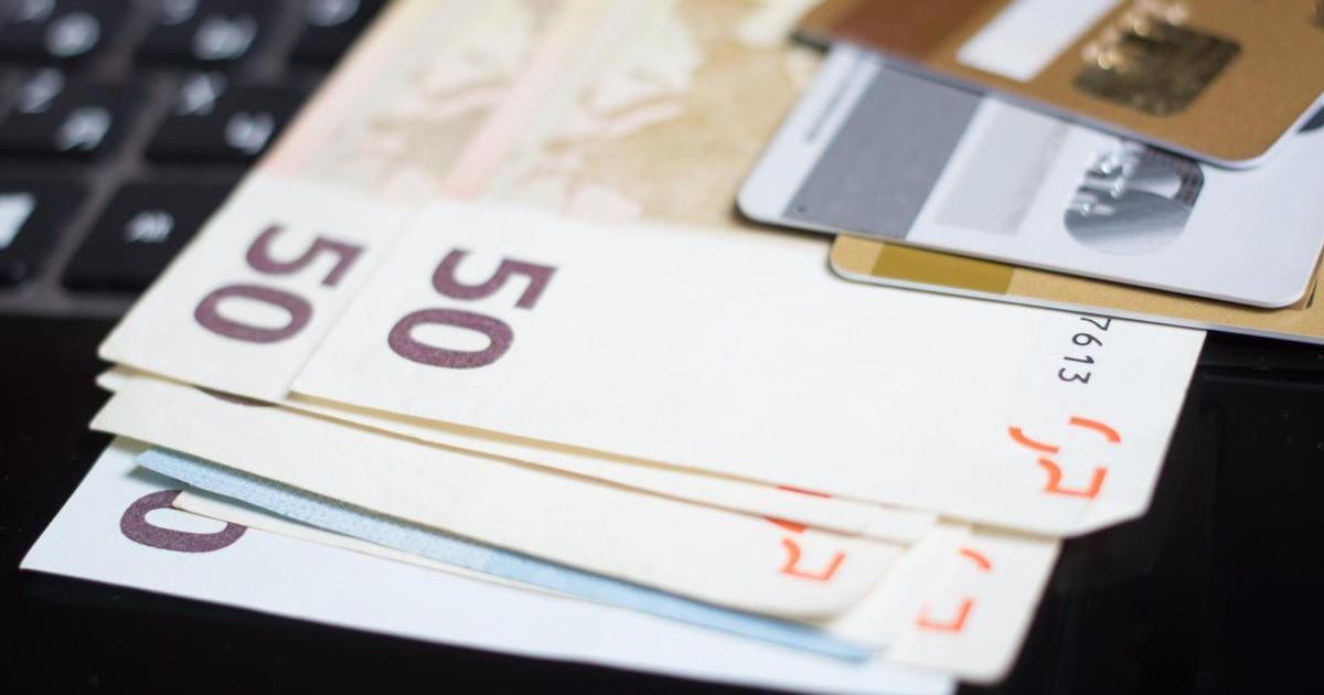 Billetes de euro y tarjetas bancarias sobre el teclado de un ordenador.
