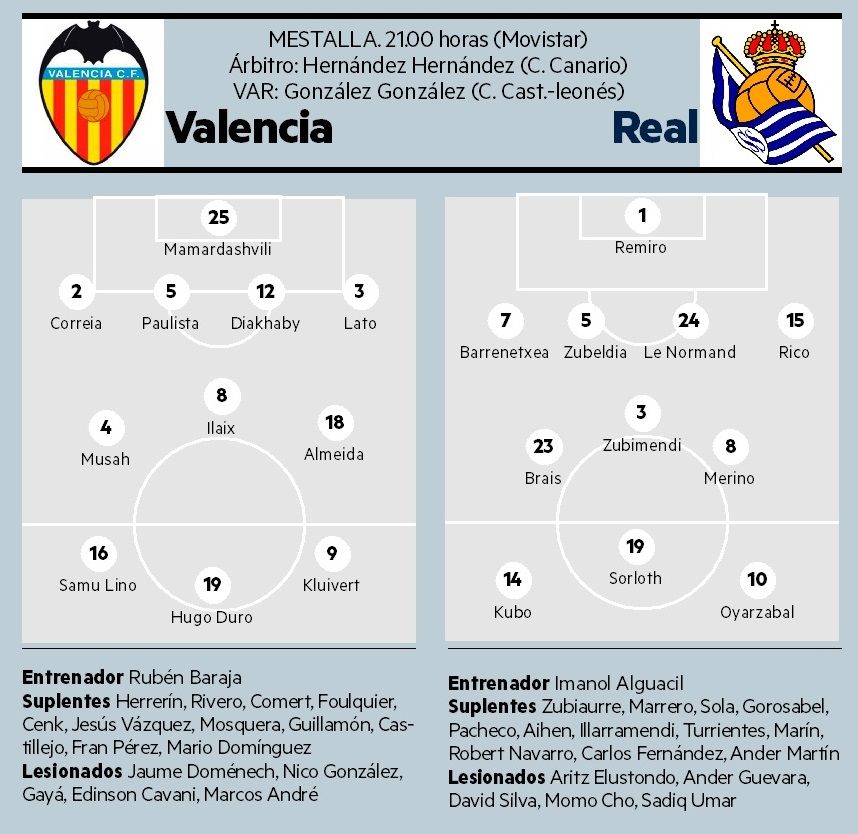 Para jugar en semejantes circunstancias a orillas del Turia, la Real recupera a Jon Pacheco y Andoni Gorosabel, las dos novedades positivas en la convocatoria. Navarro y arrasatearra ocupan las vacantes dejadas por el potrillo Urko González de Zárate y por un Ander Guevara que vuelve a quedarse fuera por problemas físicos. En lo que respecta a la alineación, mientras, Mikel Merino tiene opciones de regresar a la alineación titular en detrimento de Illarramendi o incluso de Brais Méndez. Los demás aguantarían en el once respecto al partido ante el Celta, lo cual significaría una curiosa paradoja: con Sola y Gorosabel ya disponibles, Barrenetxea continuaría en el lateral diestro. La otra gran incógnita alude al sistema, pues con los mismos futbolistas de ataque (Kubo, Oyarzabal y Sorloth) Imanol puede apostar por un 4-3-3 o por un 4-4-2 con rombo.