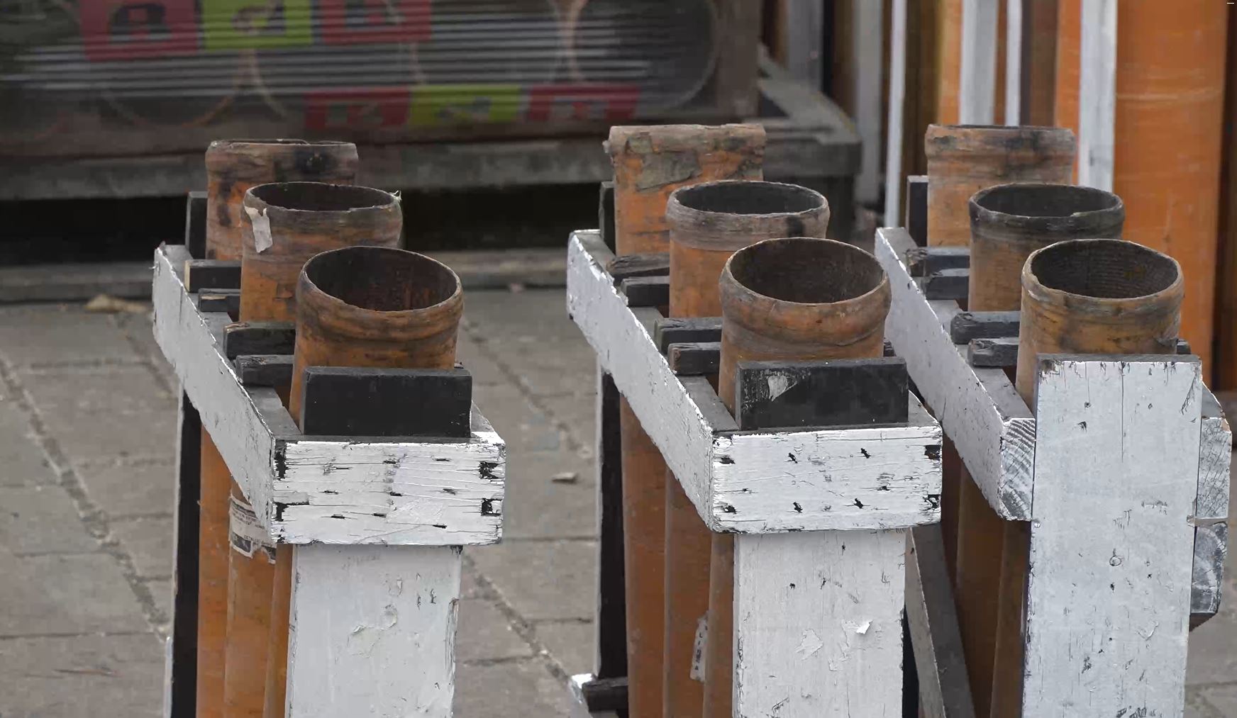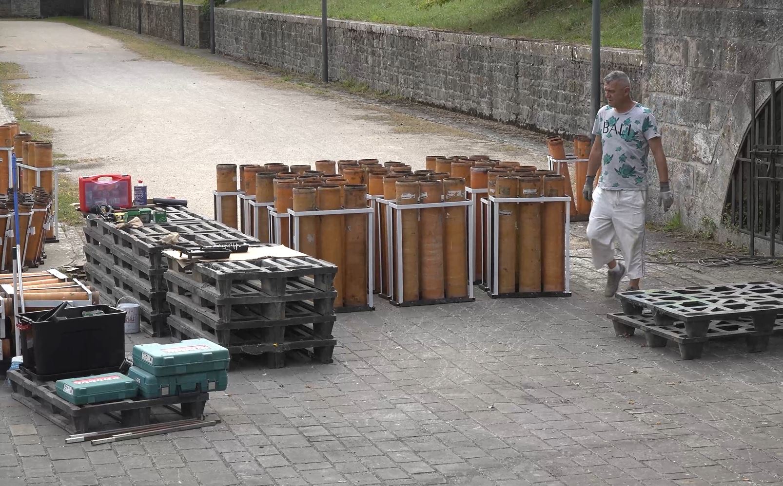 Las herramientas precisas para el disparo de las colecciones se han paletizado por calibres en cada posición de la Ciudadela, de forma que las pirotecnias tengan disponible el material y puedan elegir el que precisen. Cada empresa tiene su propia forma de organizar su producción, que se monta habitualmente por equipos en el mismo día del disparo.