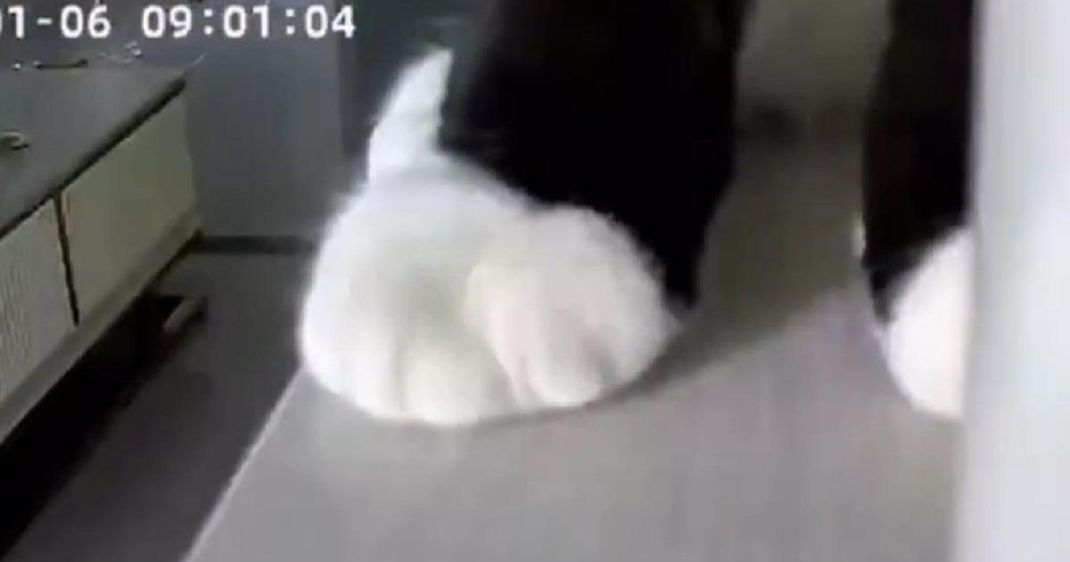 Esa persona contaba con una cámara para seguir los pasos de su gato, de color negro y blanco, cuando no se encontrara en casa y decidió activarla para ver qué estaba haciendo su mascota. En un principio no aparecía el felino, con lo que ajustó el encuadre y rápidamente pudo comprobar que estaba ahí, encaramado en algún tipo de mueble.