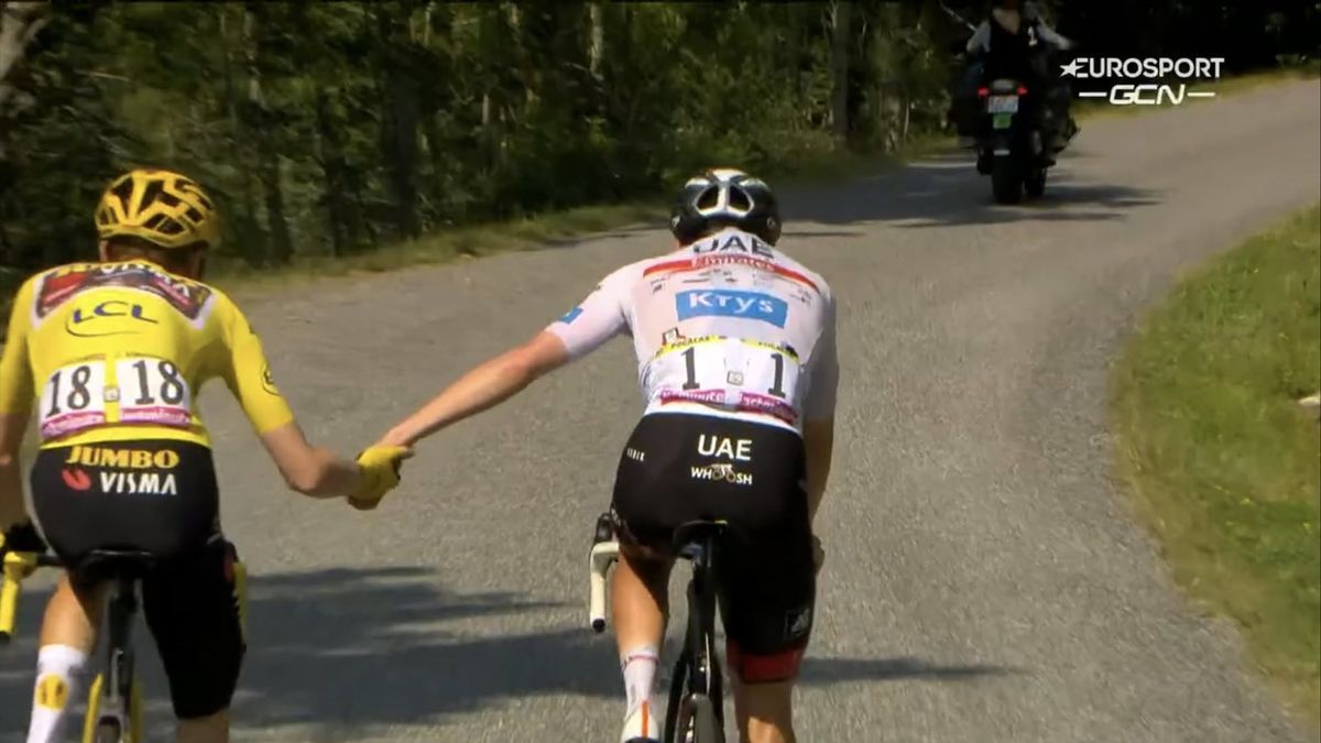 Vingegaard le esperó. La persona por encima del competidor. Empatía. El esloveno agradeció el gesto del líder. Se dieron la mano. Respeto. Pacto entre caballeros. Entente cordial hasta la fauces hambrientas de Hautacam. El episodio alteró a Pogacar, que exigía agua para el gaznate. Bramó para que llegara el coche de equipo. Nervios. Thomas y Kuss se soldaron una vez completado el descenso al líder y Pogacar, siempre exuberante. Como Van Aert, aún por el frente, junto a Pinot y Daniel Martínez.