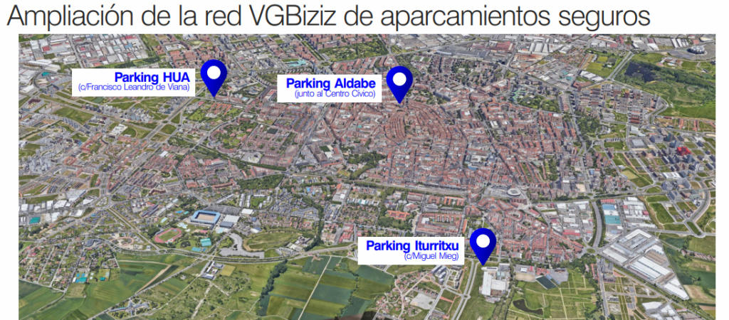 La última de las acciones anunciadas hoy contempla destinar 160.000 euros para colocar cuatro estacionamientos seguros de bicicletas "en el HUA Txagorritxu, el entorno del centro cívico Aldabe y el estacionamiento en superficie de Iturritxu", ha desvelado el primer edil.