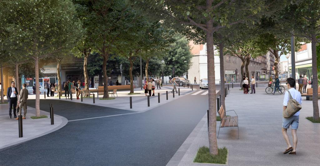 Recreación de la futura Plaza de Aldabe tras las obras de peatonalización y mejora del espacio público.