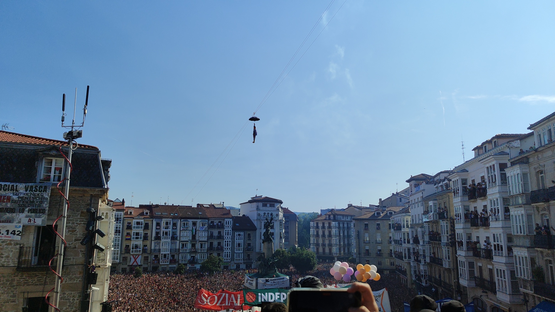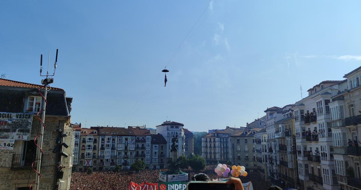 Gasteiz ya ha dado este 4 de agosto su pistoletazo de salida a las fiestas de la Virgen Blanca con la bajada de Celedón desde la Torre de San Miguel en una tarde sofocante en la que se alcanzaron los 36 grados. Iñaki Kerejazu, quien encarna al personaje de Zalduondo, se ha acordado de lo que sucede en Gaza donde han sido asesinadas ya más de 60.000 personas: "tenemos que decir alto y claro basta de genocidios en Palestina".
