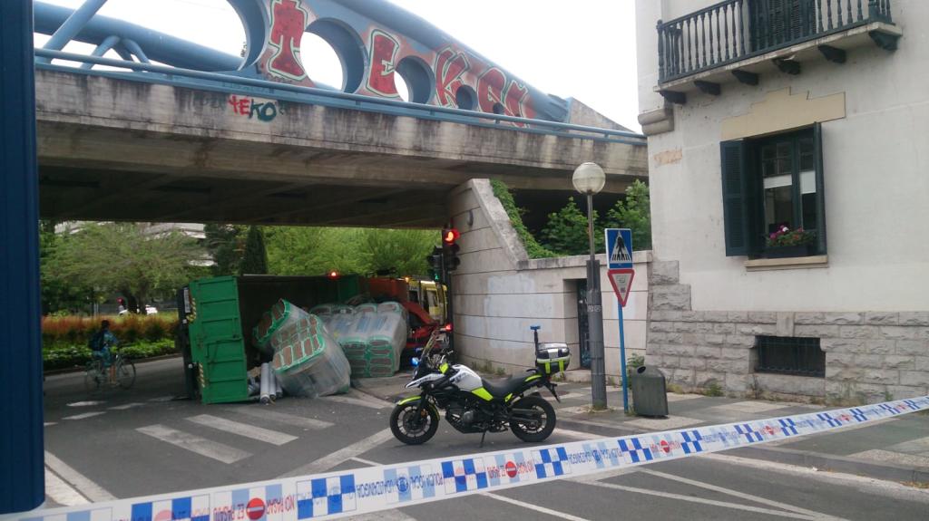 Hasta el lugar se ha desplazado otro camión para recoger el material aislante y demás elementos que conforman la carga del vehículo volcado como paso previo para poder devolverle a su posición orginal y después retirarlo para que la circulación bajo el puente Juanjo Nanclares vuelva a recuperar la normalidad.