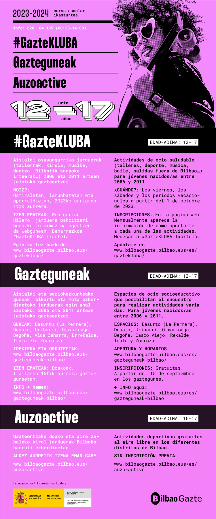 El ayuntamiento de Bilbao retoma desde mañana, viernes 15 de septiembre, la actividad de los 9 Gaztegunes que están repartidos por la Villa. La nueva programación para este curso incluye, las habituales actividades gratuitas para jóvenes entre 12 y 17 años que están dirigidas por personas educadoras.