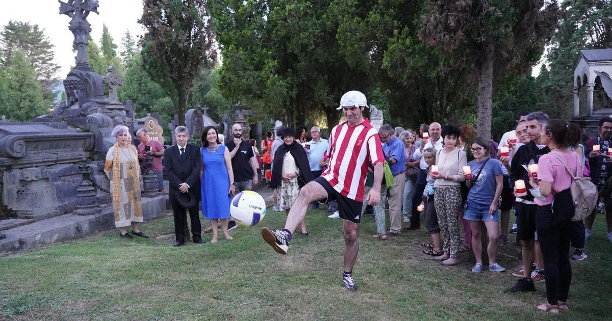 Por ejemplo, con la aparición de Rafael Moreno Pichichi se repasan los momentos de gloria del Athletic Club. Gabriel Rodrigo –edil del PP en el Ayuntamiento de Bilbao– encarnó al delantero rojiblanco retratado para la inmortalidad con su pañuelo blanco. Y con Yolanda Barroso en el papel de la escritora y periodista Juana Mir se cerraron los ojos para escuchar y despreciar la barbarie de todas las guerras. Fue fusilada con 44 años junto a 537 personas más contra un muro del cementerio. Justo antes se había escudriñado en la labor humanitaria de Casilda de Iturrizar (Elena Rodríguez). La visita terminó delante del Memorial del accidente aéreo del monte Oiz, donde Feli del Fresno recordó este luctuoso pasaje: 148 víctimas.